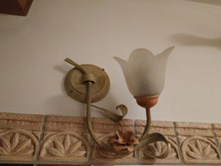 Disponibili vari lampadari, da soffitto e muro. 1 lampadario a soffitto con 5 portalampade. 2 lampadari a soffitto uguali con 2 portalampade ciascuno. 2 lampadari a muro identici con 1 portalampada. 1 lampadario a muro con un portalampada (Lampadine incluse) Eleganti lampadari in stile country, perfetti per aggiungere un tocco di charme alla tua casa. - Struttura in metallo finemente lavorato. - Dettagli in vetro soffiato che diffondono una luce calda e accogliente
