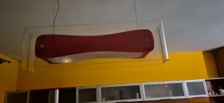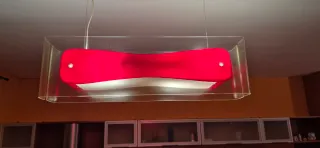 Set di due lampadari dal design moderno, con un'elegante combinazione di colori rosso e bianco. - Struttura in vetro e plastica. - Illuminazione d'effetto. Lunghezza 87 cm h 25 larghezza 17 cm