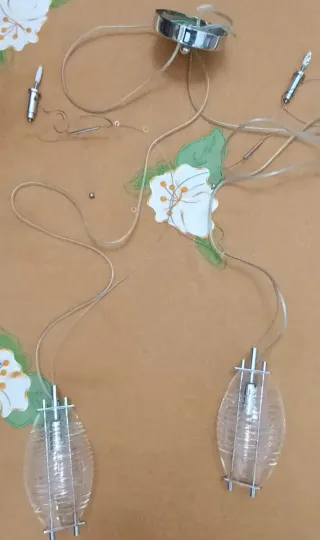Numero 2 lampadari e una plafoniera perfettamente funzionanti - Lampadario bianco con decorazioni floreali colorate. - Lampadario con catena e base in metallo.