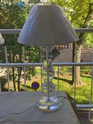 Lampadari eleganti e preziosi in metacrilato. Gli schermi sono nuovi, con etichette e plastico. Si vendono insieme (50€ ciascuno). Base e piedistallo in metacrilato trasparente. Schermi in tessuto bianco. Le lampadine non sono incluse.
