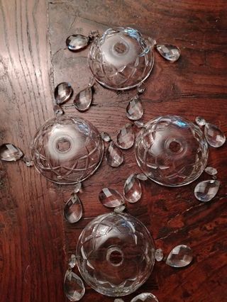 Quattro coppette in cristallo con quattro gocce ciascuna,10 cm di diametro;tre sono in perfette condizioni,una,ad un occhio attento, presenta una lieve crepa come da foto. Prezzo fisso
