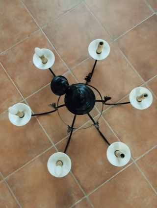 Vendo 2 lampadari in metallo, ceramica e vetro da 5 luci ciascuno. Funzionano perfettamente.