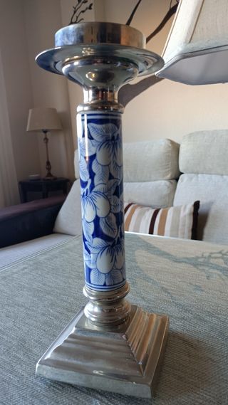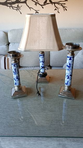 Set di 2 lampadari e lampada in ceramica e una placcatura in argento. Sono in ottime condizioni. Solo la base della lampada presenta alcune piccole rientranze sul retro che, a causa della posizione in cui è posizionata, sono praticamente invisibili (vedi foto). In realtà, sono state decorate solo per un po' e sono state conservate. La lampada non è mai stata utilizzata, ma funziona perfettamente.