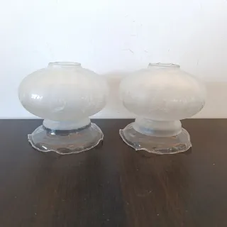 DISPONIBILI SOLO DUE UNITÀ. Prezzo 10 € per unità, 18 € per coppia. Originali anni '70. Tulipa in cristallo bianco serigrafato per lampada antica, applique, torcia, candelabro... Misure: Altezza: 16 cm, Bocca: 7 cm. Lampada art nouveau, art deco, lampada retro, stile classico, middle century, mid century, sfera in cristallo, Tiffany, Murano, anni '50, '60, '70, '80, stile classico, Ikea, maison du monde, era spaziale, space age, lampada, lampadari, antiquariato, Murano.