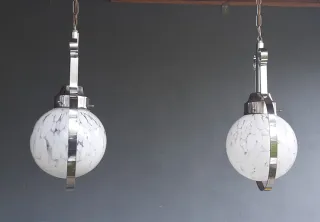 Coppia di Lampadari in metallo cromato e vetro soffiato a macchie bianche di Murano, in ottime condizioni.