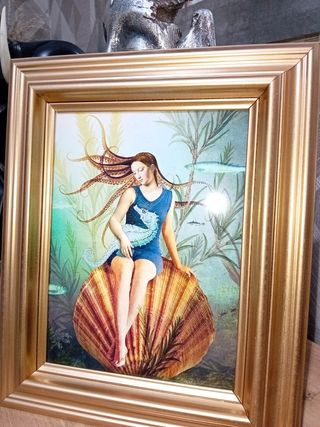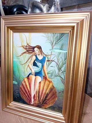 Bellissimo dipinto in stile surrealista con l'immagine di una donna in mare seduta su una conchiglia. Nel mio profilo ho altri quadri ideali per composizioni. Include un foglio montato su una cornice dorata. Deve essere appeso. La cornice inclusa misura 33,5 cm di altezza x 27,5 cm di larghezza. Vedi altre cose nel mio profilo. Ho oggetti decorativi, mobili da bar, mensole, specchi, rattan, lampadari, frida, sedie enea restaurate, sgabelli, pouf, portabottiglie, maschere africane, porte restaurate, quadri, mobili a fumetti, specchi a fumetti, cassetti restaurati, enea, shabby, rattan, giardino, fioriere, vintage e altro ancora.