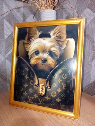 Bellissima 💖 foto con pellicola per cani all'interno di una borsa Louis Vuitton. Include lastra montata su vetro e cornice in legno dorato. Deve essere appeso. Misura 33 cm di altezza e 27 cm di larghezza. Vedi altre cose nel mio profilo. Ho oggetti decorativi, lampadari, specchi, mensole, sedie restaurate, sedie squallide, molti quadri, mobili da bar, portabottiglie nero, sedie enea e pino restaurate, mobili da botteghino in legno castigliano restaurati, tavolini shabby e vintage, tavolino a fumetti, specchio a fumetti, maschere africane in legno, porte restaurate e altro ancora.