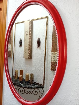 Bellissimo 💖 unico ed esclusivo specchio antico ovale vintage in legno rosso con perline di perle sul bordo. Molto squallido. Per arredare qualsiasi ambiente. Deve essere appeso. Misura 80 cm di altezza e 59 cm di larghezza. Vedi altri articoli nel mio profilo. Ho restaurato oggetti decorativi come sedie restaurate, mensole, specchi, tavolini da caffè, tavolini, lampade, lampadari, lampadari, shabby, chic, bohémien, mobili da bar, gabbie, molti quadri, mobili comici, specchi a fumetti, cornici di grandi dimensioni, vintage, enea, rattan e altro ancora.