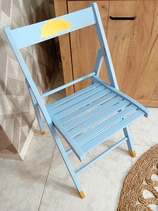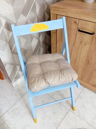 Bella e decorativa sedia pieghevole in legno di colore blu chiaro. Regalo un nuovo cuscino che ho comprato per scattare le foto. Personalizzato con gambe e decorazione in piuma dorata che lo rende più decorativo. Misura 78 cm di altezza. 38 cm di larghezza. 40 cm di profondità. Altezza dal pavimento alla seduta 44 cm. Vedi altre cose nel mio profilo. Ho restaurato oggetti decorativi come porte, mensole, tavoli, comodini, tavolini, chic, rattan, lampadari, lampade, lampade, grandi cornici, specchi, mobili, bar, fumetti, mobili da bar, shabby, vintage, molti quadri e altro ancora.
