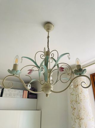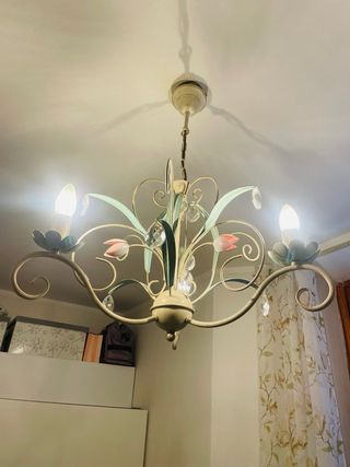 Vendo tre lampadari e un’applique in stile shabby chic tutti della marca Luciamo: corpo color crema, foglie verde salvia chiaro e fiori rosa pastello tutto con riflessi dorati, sono presenti anche dei cristalli a goccia sulle punte delle foglie. I lampadari misurano 40cm di altezza e 50cm di larghezza l’applique invece 23cm di altezza e 26cm di profondità. I lampadari hanno 3 lampadine l’uno. Comprati nel 2021 sono perfettamente funzionanti e praticamente nuovi. Li vendo tutti insieme per 200€ e la consegna è preferibile a mano data la mole degli oggetti. Li vendo per un cambio di stile alla casa ma sono bellissimi!