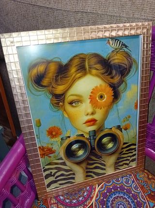 Quadro con pellicola raffigurante una ragazza con binocolo e fiori. Nel mio profilo ho altri quadri ideali per composizioni. Include lastra montata su vetro e cornice dorata. Deve essere appeso. La cornice inclusa misura 44,5 cm di altezza x 34,5 cm di larghezza. Vedi altre cose nel mio profilo. Ho oggetti decorativi, mobili da bar, mensole, specchi, lampadari, frida, sedie enea restaurate, sgabelli, pouf, portabottiglie, maschere africane, porte restaurate, quadri, mobili a fumetti, specchi a fumetti, cassetti restaurati, enea, shabby, rattan, giardino, fioriere, mobili castigliani vintage e restaurati e altro ancora.