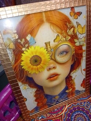 Quadro con pellicola di occhiali da bambina a forma di margherita. Nel mio profilo ho altri quadri ideali per composizioni. Include lastra montata su vetro e cornice dorata. Deve essere appeso. La cornice inclusa misura 44,5 cm di altezza x 34,5 cm di larghezza. Vedi altre cose nel mio profilo. Ho oggetti decorativi, mobili da bar, mensole, specchi, lampadari, frida, sedie enea restaurate, sgabelli, pouf, portabottiglie, maschere africane, porte restaurate, quadri, mobili comici, specchi a fumetti, cassetti restaurati, enea, shabby, rattan, giardino, fioriere, mobili castigliani vintage e restaurati e altro ancora.