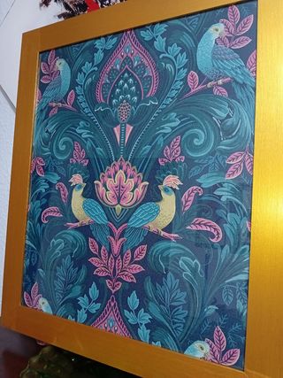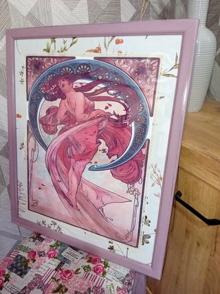 Bellissimo, unico ed esclusivo dipinto in stile Art Noveau con tessuto in tela i.resa de Musa. Sfondo stampato su pallet e bordi in pizzo per un tocco più delicato. Include un lizo montato su vetro e una cornice in legno viola. Deve essere appeso. Tanti dettagli e colori. La cornice inclusa misura altezza 64,5 cm e larghezza 54,5 cm. Ho pubblicato altri quadri dello stesso stile ideali per composizioni. Vedi altre cose nel mio profilo. Ho oggetti decorativi vintage come sedie restaurate, tavoli, tavolini, mensole, specchi, mobili comici, mobili restaurati, lampadari, shabby, molti quadri e altro ancora.