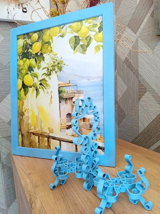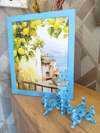 Bellissimo, confezione, set, lotto di pittura con cornice in legno turchese e tessuto in tela stampata di alta qualità Paesaggio mediterraneo. Contiene oggetti come candele, bicchieri, bottiglie di ferro turchese insieme al quadro che misura 44,5 cm di altezza x 36,5 cm di larghezza. Il portaoggetti misura 20 cm di altezza. Larghezza base 28x14 cm. Il prezzo è riferito ai due pezzi Vedi altre cose nel mio profilo. Ho oggetti di arredamento vintage, shabby, chic, librerie, lampadari, mobili restaurati, specchi, maschere africane, testiera rosa, specchio rosa, grandi cornici dorate, molti quadri e altro ancora.