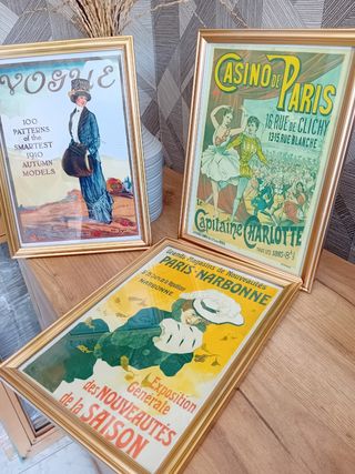 3 quadri dorati con fogli pubblicitari francesi d'epoca. Include lastra montata su vetro e cornice dorata. 15 EURO PER UNITÀ. Devono appoggiarsi e appendersi. La cornice inclusa misura 32,5 cm e una larghezza di 23,5 cm. Vedi altre cose nel mio profilo. Ho oggetti decorativi come sedie restaurate, sedie enea, librerie, tavolini, specchi, shabby, chic, vintage, lampadari, appendiabiti, porte restaurate, maschere africane, molti quadri, moda e altro ancora.