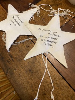 Stelle realizzate a mano leggermente imbottite con bellissime frasi sulle stelle scritte a mano e impreziosite da nastrini e perline sul fondo. Bellissime da appendere a lampadari, maniglie ganci ,specchi, finestre quadri per rendere caloroso l’ambiente ! Belle e originali anche da regalare , misure in foto! #pensierispeciali #stelle #stella #faitmain #handmade #regalospeciale #regalospeciale #frasiaugurali #present #pensiero #regalounico #stars #geshenk #sterne #amicizia #frasicelebri #aforisma #stella #stellericamate #pezzounico #handmade #handmadewithlove #regalo #luciodalla #starsaddict #star #ornament