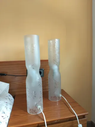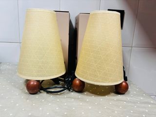 Belli lampadari da comodino, ideali per un'illuminazione calda. Si vendono insieme. Design elegante e semplice. Schermo di carta con texture. Base in legno di rovere marrone. Due lampade incluse.