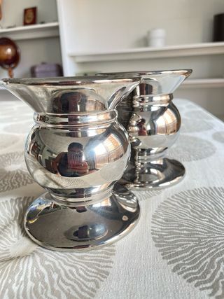 Set portacandele in ceramica smaltata argentata Zara Home UNUSED, non sono mai stati usati. Misure: 10 cm. di altezza e 9 cm. di diametro ca. Sono disponibili due set (4 lampadari in totale). In vendita un gioco a 9€ ed entrambi i giochi a 15€.