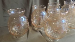 Due bocce bocce vintage in vetro per lampadari. Nelle foto se ne vedono 6 ma 3 sono state vendute; una invece ha una parte scheggiata alla base, quindi va in omaggio a chi acquista le due rimaste. Dimensioni circa: altezza totale 17 cm, senza la base che si inserisce nel lampadario 15 cm. Diametro alla base circa: esterno 5,5 cm, interno 4,4 cm. A proposito del pezzo danneggiato alla base: una una volta inserito nel lampadario il danno non risulta visibile in quanto nascosto dalla cornice.