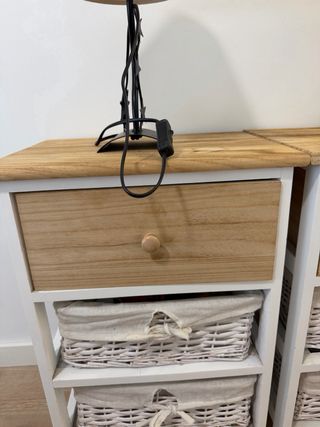 Set di due comodini con lampade abbinate. Ogni comodino ha un cassetto e due cesti in vimini. Struttura in legno. Cassetto con maniglia in legno. Cestini in vimini con fodera in tessuto. Lampade con base in metallo e paralume in tessuto.