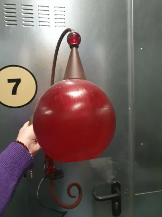 Due lampade da soffitto con un design festivo e originale. Misurano 22,5 cm di diametro e 77 cm di altezza totale, con la lampada che misura 15 cm. La base è in bronzo, verniciata a spruzzo di rosso, per poterla riverniciare. Il cavo è rosso come si vede nelle foto, il verde è una ghirlanda decorativa che può essere rimossa. Sono due unità, 20€ l'unità. - Decorazione con foglie verdi e frutti rossi. - Base e paralume in colore rosso.