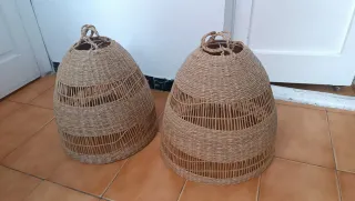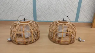 Set di due lampade a sospensione con un design naturale e organico. Perfette per aggiungere un tocco caldo a qualsiasi ambiente. Realizzate con materiali naturali. Struttura intrecciata con dettagli traforati. Includono maniglia superiore per appenderle.