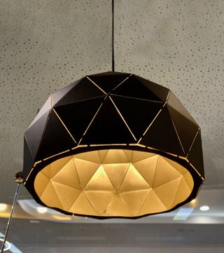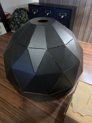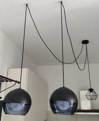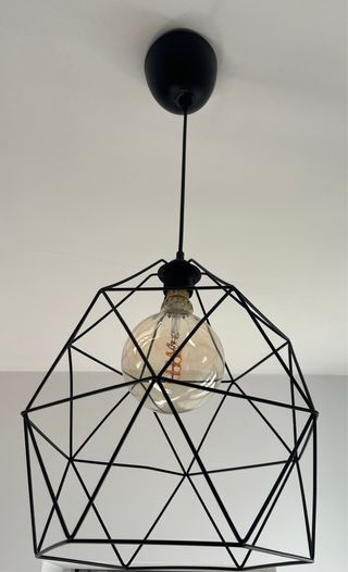 In vendita due lampade a sospensione dal design geometrico. Struttura in metallo, colore nero, altezza 39 cm, diametro 25 cm. Include il cavo per appenderle. Le lampadine non sono incluse.