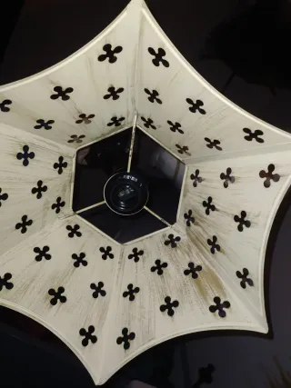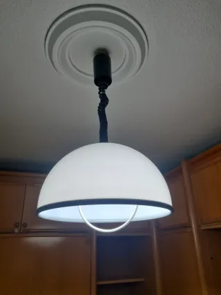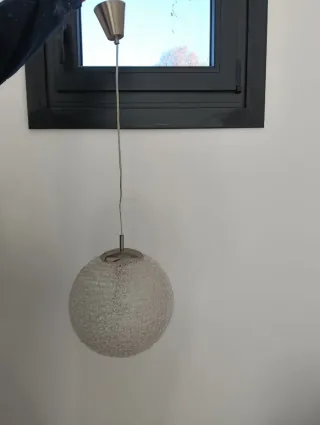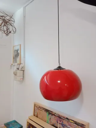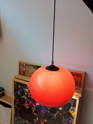 Lampada a sospensione dal design vintage con un aspetto accattivante. Molto originale. - Forma sferica. - Finitura brillante. - Tutto il cablaggio è nuovo. Dimensioni paralume: Diametro: 38 cm e altezza: 28 cm. Quando è accesa, il colore sembra più arancione che rosso. È bellissima. È in buone condizioni con segni evidenti dovuti al passare del tempo. Pesa molto poco.