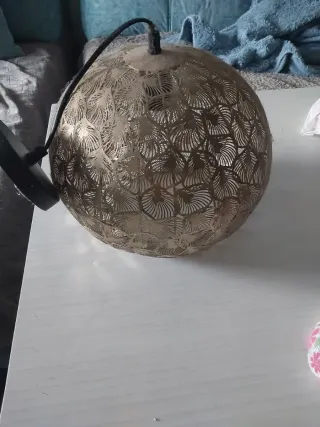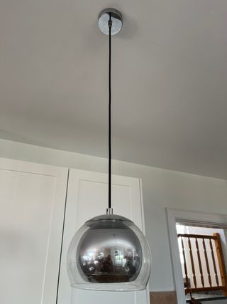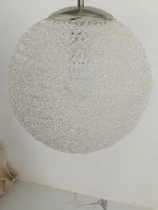 Lampada a soffitto a sospensione con un design moderno ed elegante. Il suo finiture argentato e trasparente dona un tocco sofisticato a qualsiasi spazio. Ne ho due, ma una si è rotta e manca la parte in vetro. L'altra è in perfette condizioni. Design sferico. Combinazione di materiali.