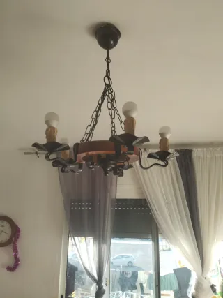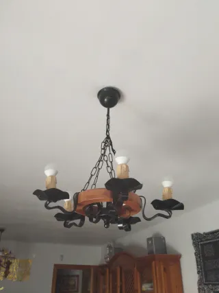 Lampada a sospensione con un design rustico ed elegante. Combina materiali in legno e metallo. Colore principale nero e marrone.
