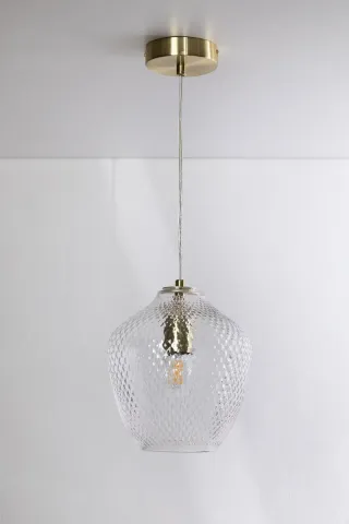 Lampada a sospensione elegante con dettagli dorati e paralume in cristallo. Finitura metallica dorata. Paralume in cristallo traslucido.