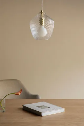 Lampada a sospensione elegante con design moderno e sofisticato, modello Taylor di Sklum. Nuova, in confezione originale, mai utilizzata. Disponibili due unità. - Schermo in cristallo texturizzato. - Dettagli in metallo con finitura dorata.