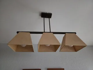 Elegante lampadario a sospensione con un design moderno, ideale per cucina, zona pranzo o open space. - 3 punti luce - Cavi regolabili per adattarsi a diverse altezze. - Finitura in metallo e vetro - Incluso anche un paralume aggiuntivo rotondo come quelli in foto - Perfettamente funzionante