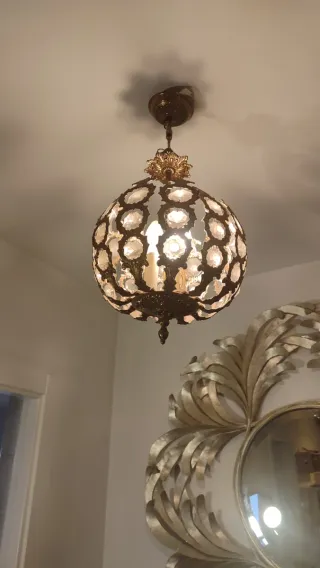 Lampada a sospensione elegante in stile vintage. Il suo design sferico e i dettagli in metallo le conferiscono un tocco sofisticato. Struttura metallica con finitura dorata. Dettagli in cristallo trasparente. Design sferico.