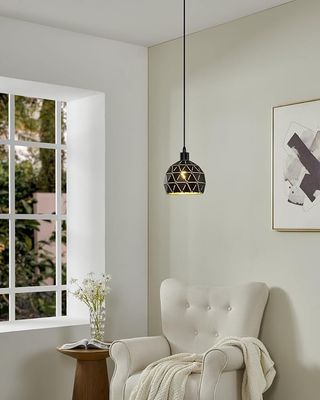 Lampada a sospensione con un design unico ed elegante. Struttura in metallo. Finitura beige con dettagli in nero. Design con fori decorativi.