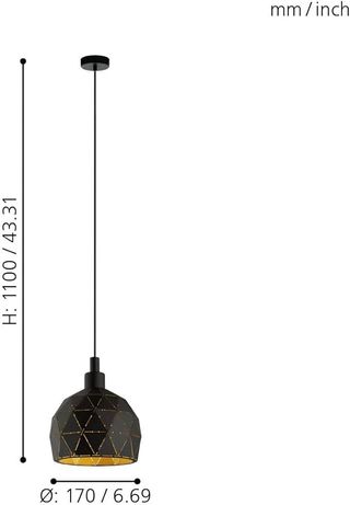 Preziosa lampada a sospensione del marchio Eglo, modello Roccaforte. In metallo, con un design elegante e sofisticato. Si abbina perfettamente a qualsiasi ambiente. Colore nero con dettagli dorati. Forma sferica con dettagli geometrici.