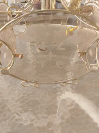 Lampada a sospensione elegante con un design delicato. Struttura metallica dorata. Pannelli in vetro traslucido. Dettagli ornamentali a spirale.