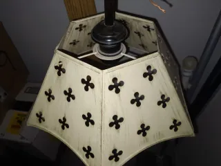 Set di lampade in stile vintage, incluse lampade a sospensione eapplique. - Lampada a sospensione con dettagli dorati e argentati. - Lampada a sospensione con struttura in metallo nero e dettagli in legno. - Applique in cristallo con finiture argentate. - Due sfere decorative gialle.