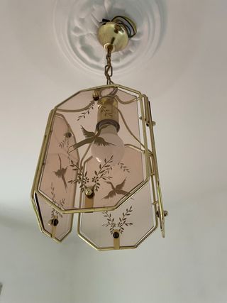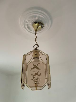 Lampada a sospensione elegante con un design unico. Pannelli in cristallo rosa con motivi di uccelli e rami. Struttura e catena in finitura dorata. Attacco E27 per lampadina (non inclusa).