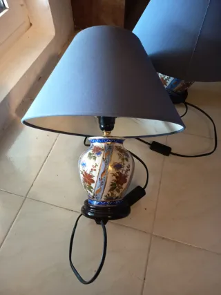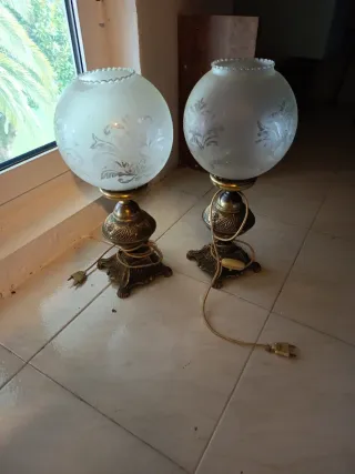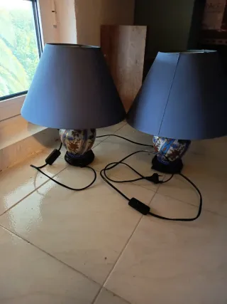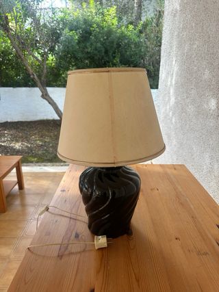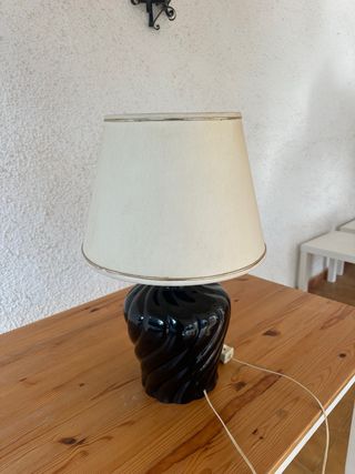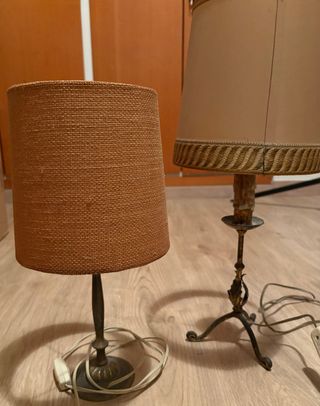 Set di due lampade da tavolo con un design vintage. - Schermi in tessuto color beige. - Basi e corpi in legno nero. - Decorazione decorativa sugli schermi. Sono antiche ma verniciate con vernice di buona qualità, il cavo è stato sostituito. La base è metallica con un buon peso, isolante della lampadina in porcellana. Se si desidera cambiare lo schermo, si trovano facilmente in ferramenta, Leroy, Shein, AliExpress, ecc. Lo schermo può presentare alcune crepe nel plastica interna. Hanno lampadine LED