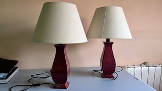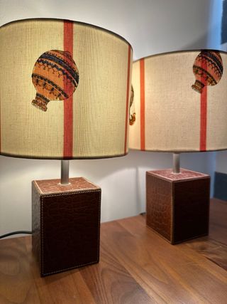 Coppia di lampade da tavolo Le Dauphin con un design elegante. Base in plastica color carminio, altezza 50 cm solo base, 80 cm con paralume in tessuto. Paralume in tessuto color beige. Funzionano correttamente. Una delle due lampade ha dei difetti nella parte inferiore. Non effettuo spedizioni personali, solo tramite Wallapop. Per qualsiasi domanda, chiedere.