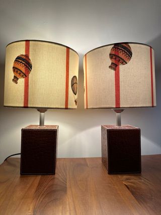 Lampade da tavolo con un design unico e originale. - Schermo in tessuto con stampa di palloncino aerostatico. - Base quadrata con finitura in similpelle. - Dettagli di cucitura sulla base. MISURE: - Totale: 32,5x20 - Base: 12x9 - Schermo: 15,5x20