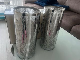 Set di due lampade da tavolo con un design moderno ed elegante. Perfette per aggiungere un tocco di luce a qualsiasi stanza. Base in metallo argentato e tattile. Schermo cilindrico in cristallo bianco.