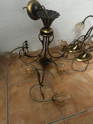Set di illuminazione come NUOVO che include una lampada da soffitto e due lampade da tavolo. - Lampada da soffitto con design floreale. - Due lampade da tavolo abbinate. - Finitura in tonalità dorata.