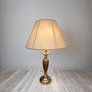 Lampada da tavolo con un design classico ed elegante. Lo schermo in tessuto offre una luce calda e accogliente. Base in legno con dettagli torniti. Schermo in tessuto color beige.