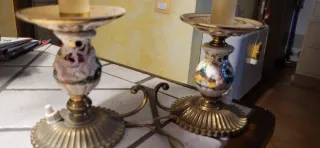 Elegante coppia di lampade da tavolo con base in metallo dorato e dettagli in ceramica dipinta. In porcellana di CAPODIMONTE con decoro di Cherubini - Paralumi in tessuto grigio. - Base in metallo finemente lavorato. - Decorazioni floreali in ceramica. - Stile vintage e raffinato.