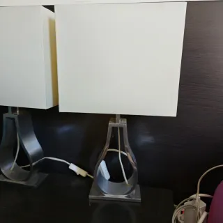 Lampade da tavolo eleganti con un design moderno. Prezzo per lampada. Base metallica con finitura argentata. Schermo bianco quadrato. Cavi in plastica bianca.