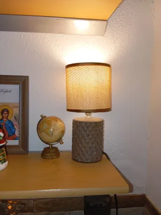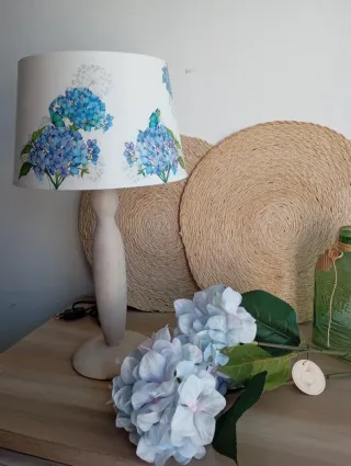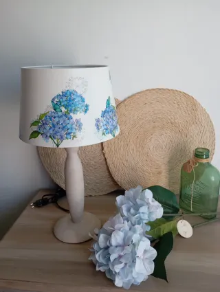 La base misura 25 cm di diametro e l'altezza totale della lampada, compreso lo schermo, è di 48 cm. Il piedistallo è in legno rivestito in juta con una patina dorata. Funziona perfettamente, lo schermo è bianco con un decoupage di ortensie blu e bianche. Un pezzo molto basico e vintage da mettere nell'ingresso o sopra un buffet, o sul comodino. Ho altri prodotti nel mio profilo. Effettuo spedizioni. Instagram: el_rincon_de_arru