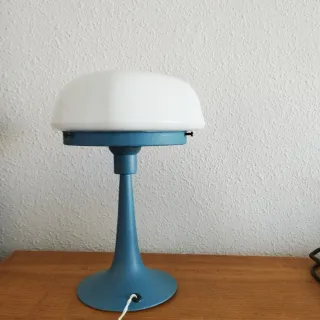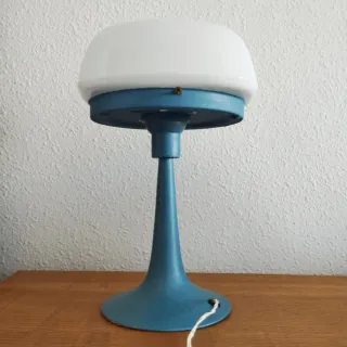 Lampada da tavolo con un design vintage, moderno ed elegante. Base e piedistallo in blu. Paralume in opalino con forma a cupola bianca.