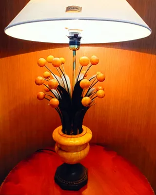 Lampada da tavolo elegante con un design floreale unico. Base: metallo bronzo massiccio lavorato con dettagli in rilievo. Foglie: metallo bronzo con design realistico. Paralume: conico bianco. Decorazione centrale: ramo di fiori con sfere di marmo arancione.